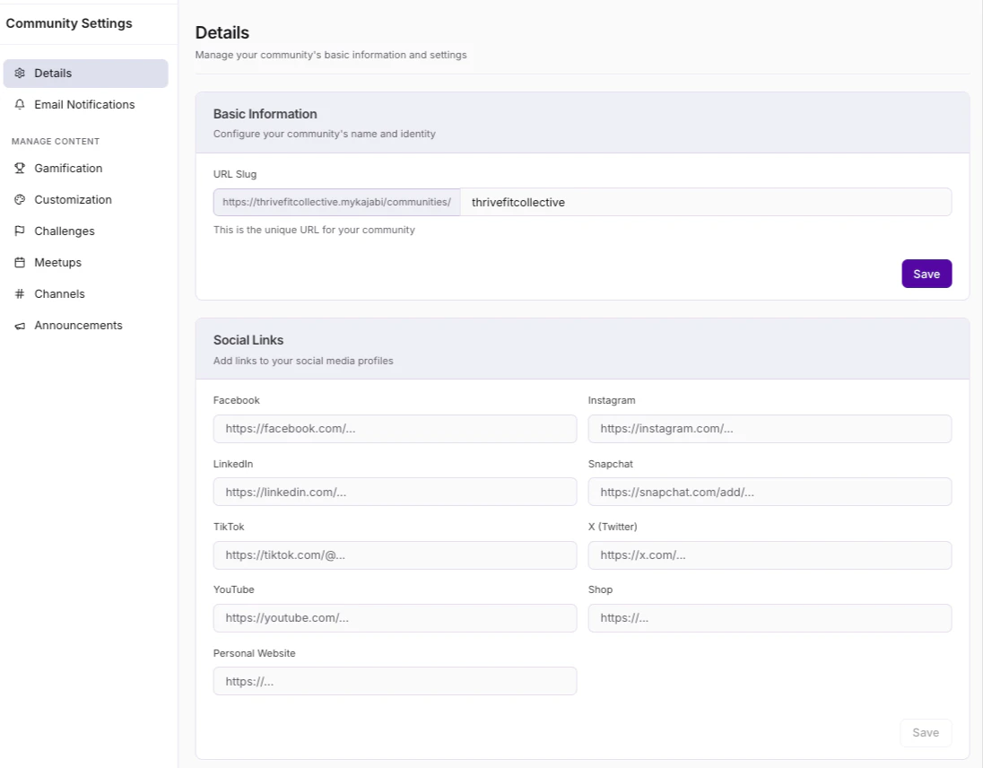 - Navigate to the Social Links section on the Community Details page.