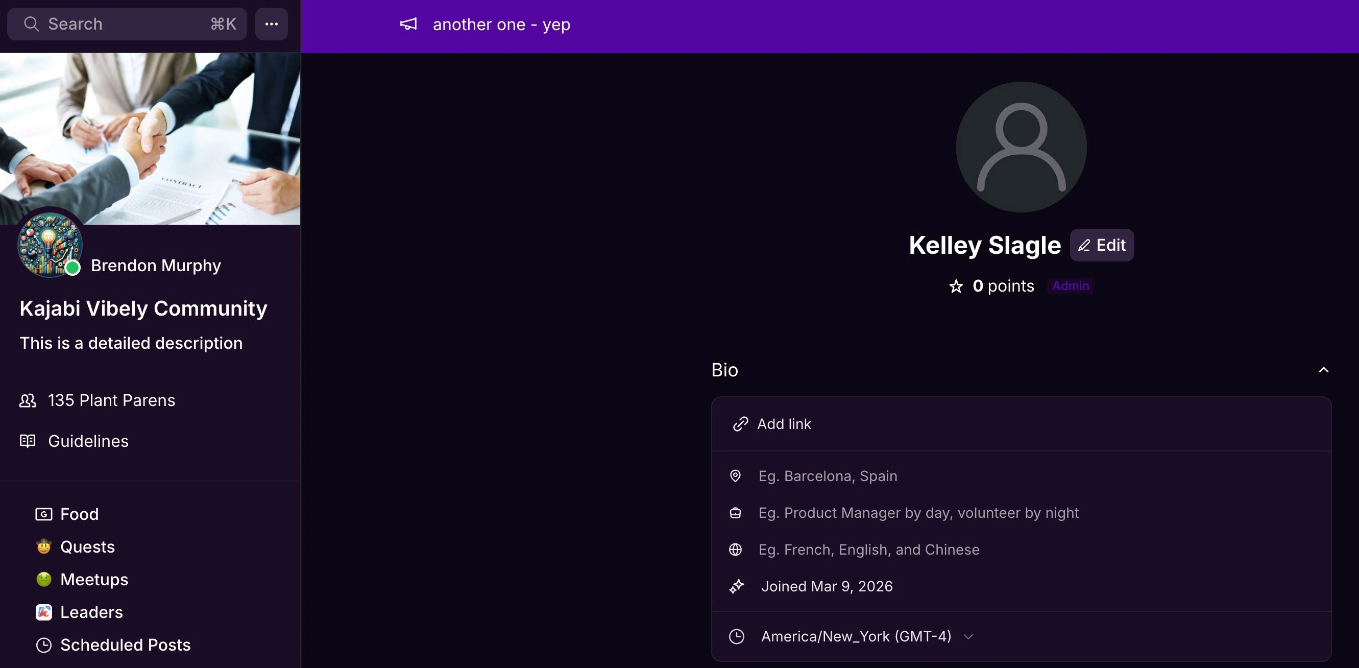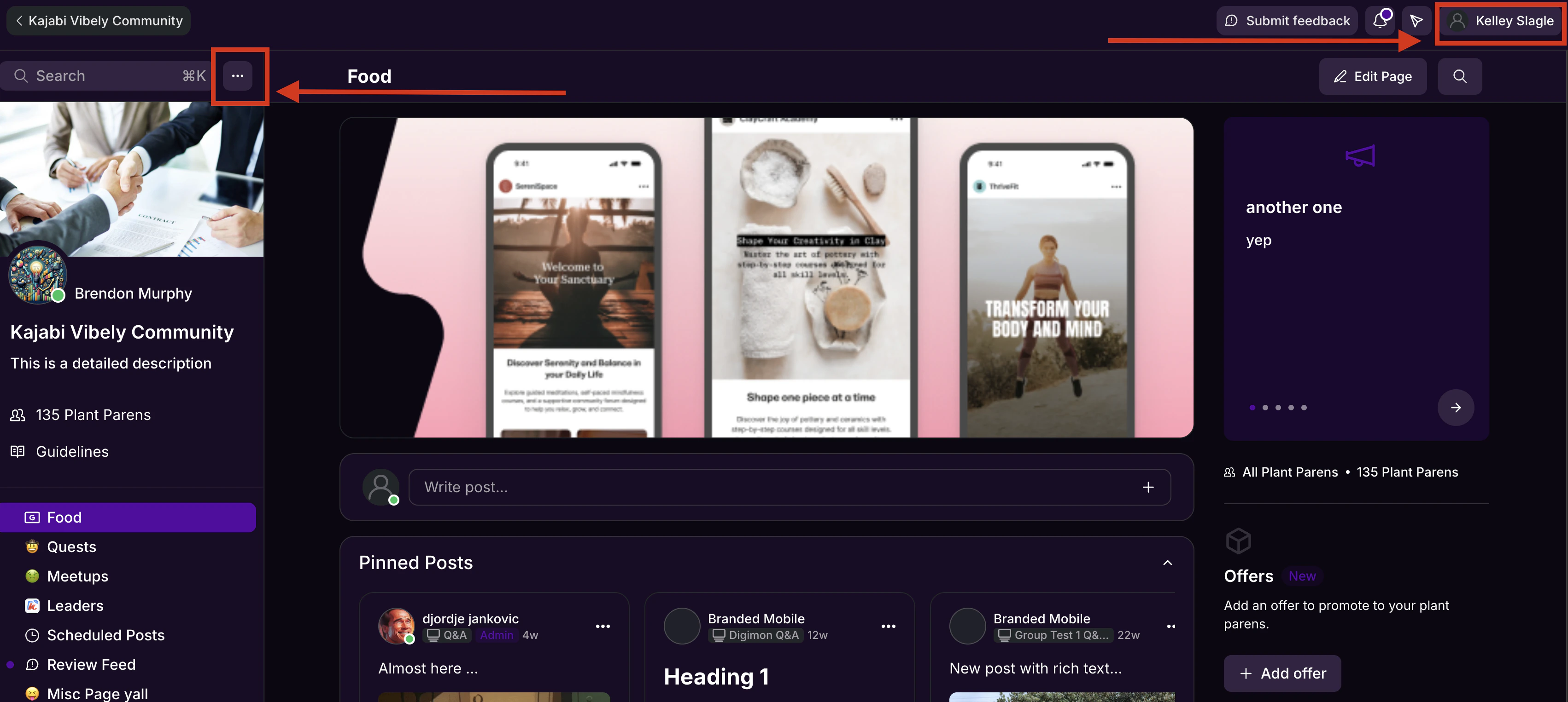 - To view your changes, click the Community Title in the top left to return to the Kajabi Dashboard, then click your name in the top right corner to open your Profile.