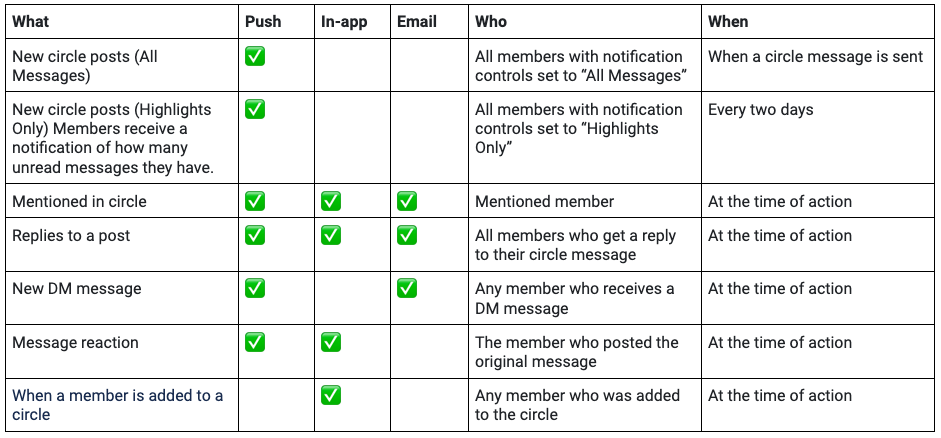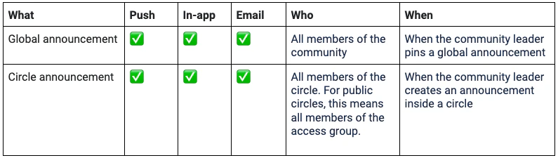 The following charts show which notification types are available for each Community feature. You and your Moderators, Administrators, and Community members can customize and receive these notifications.Channels & DMs