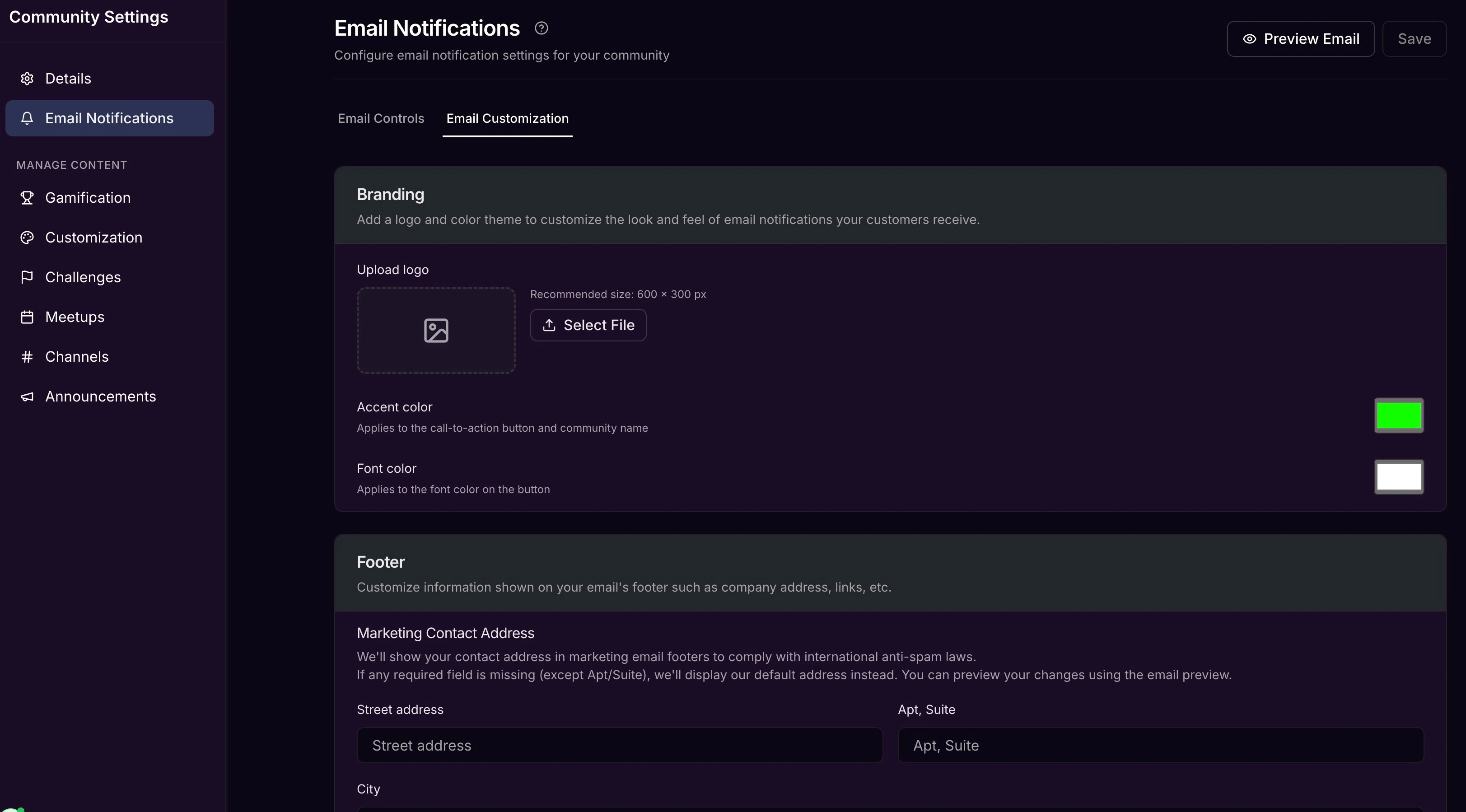 Select the Email Customization tab in your Email Notifications settings to update the branding and footer information that appears on your Community email notifications: