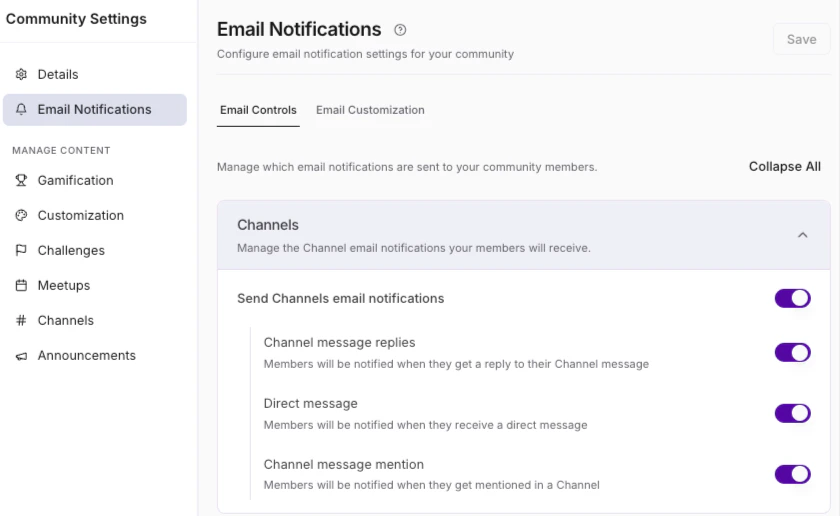 - On the Email Controls tab, click each toggle on or off as desired to enable or disable notification emails for Channels, Challenges, Meetups, Live Rooms, Announcements, and Weekly Digest.
