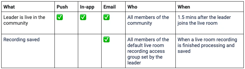 - Recording is available (members) — Members are notified when a Live Room recording is available