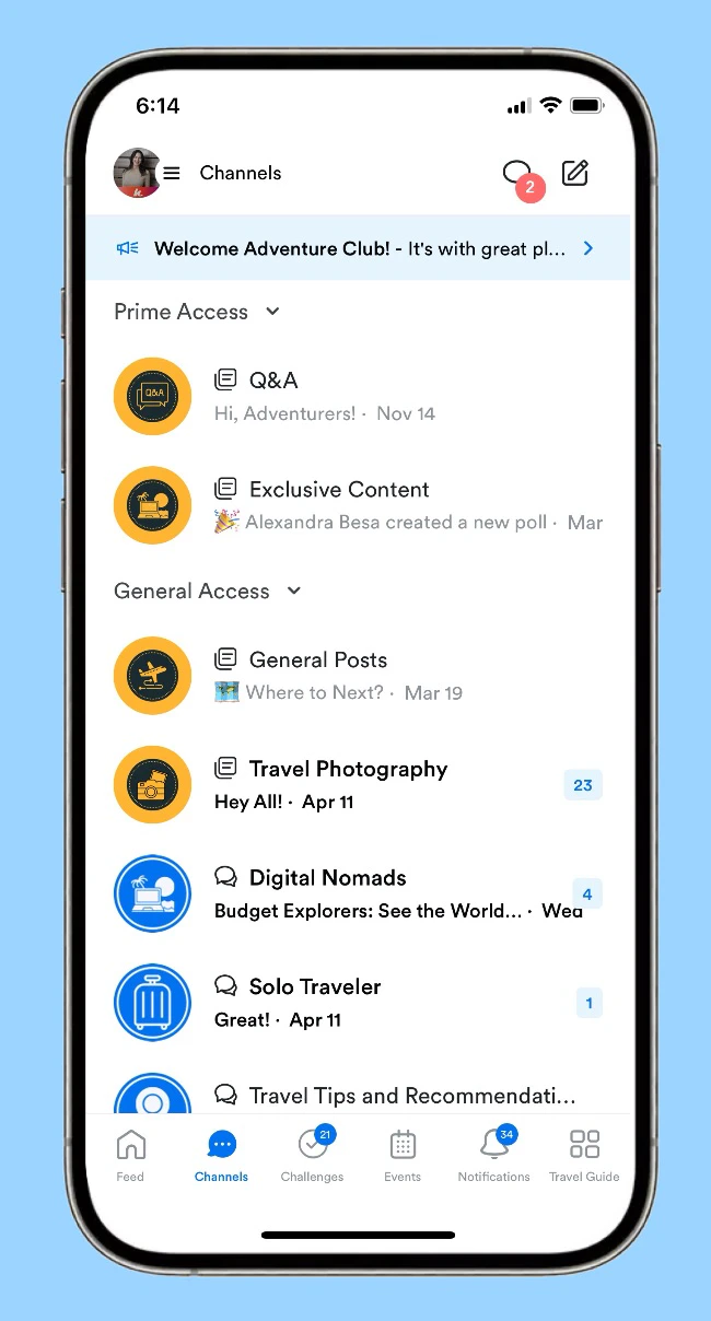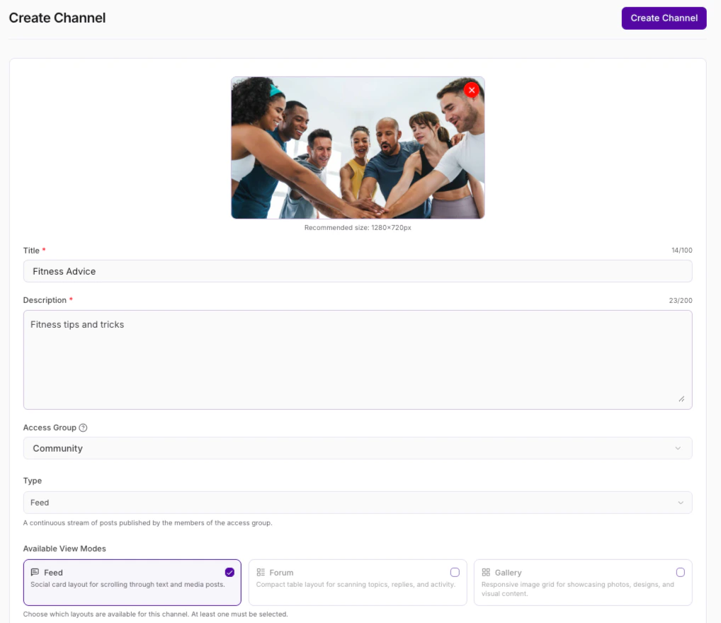 A Feed supports posts and topic threads. It displays in a feed-style layout where members can post photos, videos, share content, and show appreciation. A Chat is a group conversation where you can exchange messages with members.Channel topic ideas