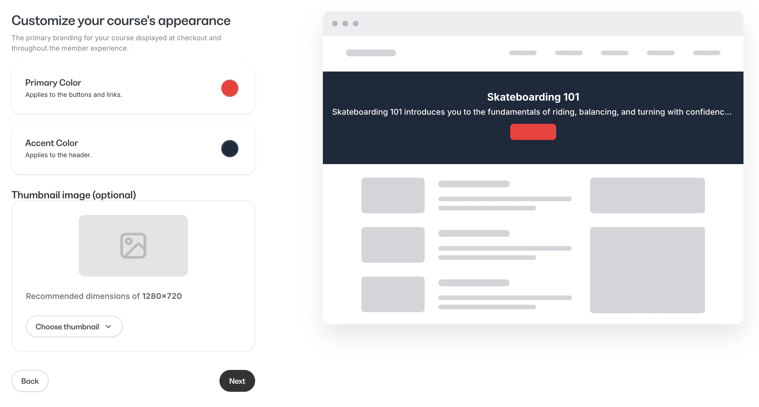 - Choose a Primary color, Accent color, and Thumbnail image. Click Next.