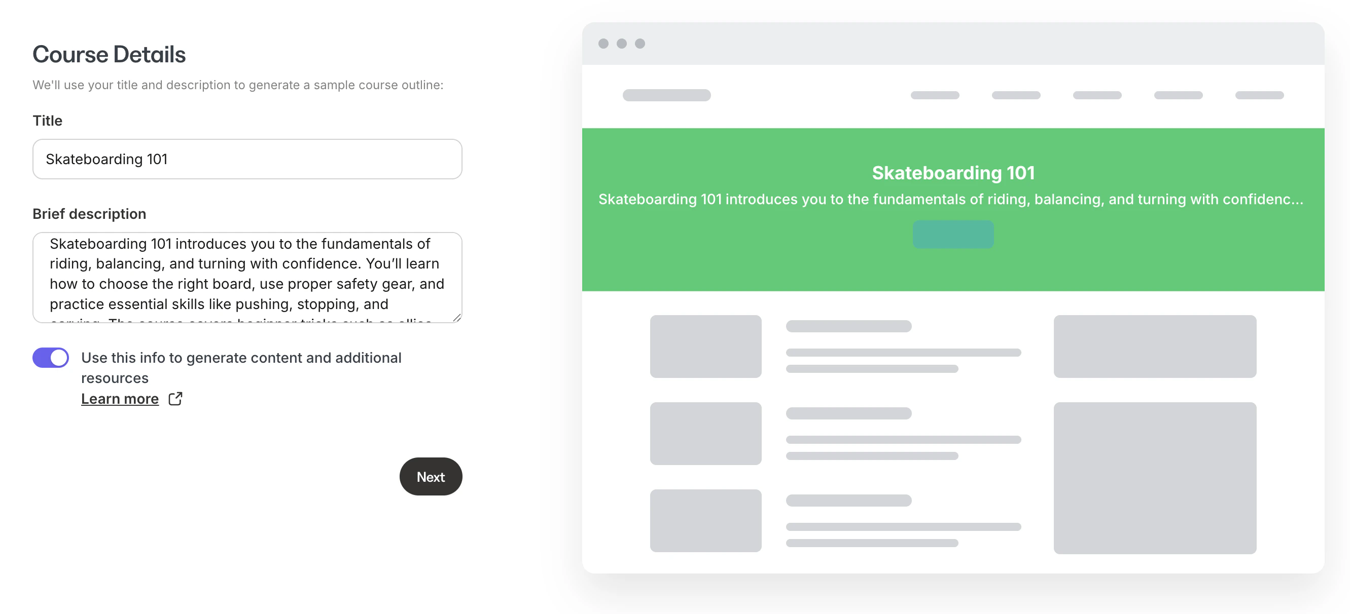 - If the toggle Use this info to generate content and additional resources is enabled, AI will automatically generate modules and lessons for your course.
